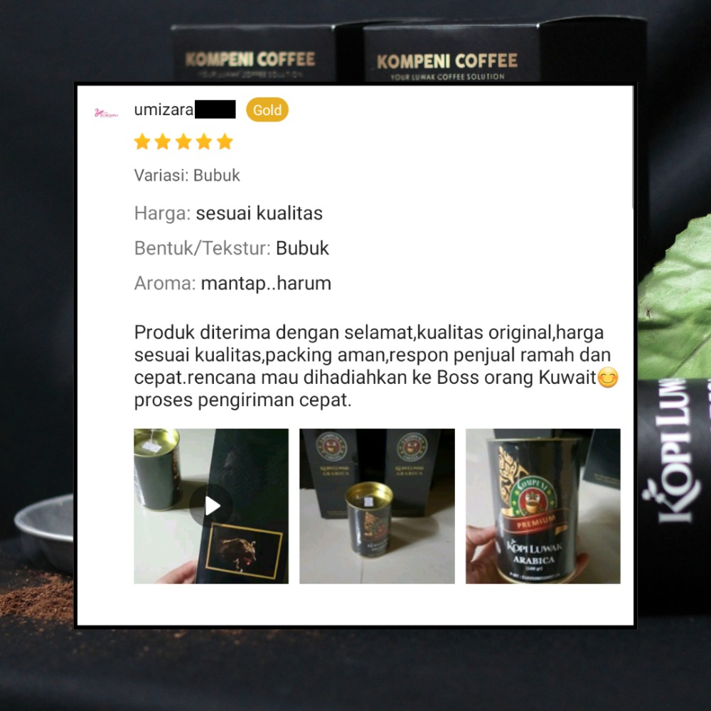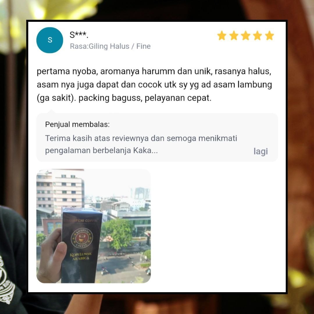 Testimoni Santhi (Customer Shopee): Pertama kali beli disini, soalnya mau hadiah ke mama mertua, soalnya kopi luwak brand lain mahal banget.